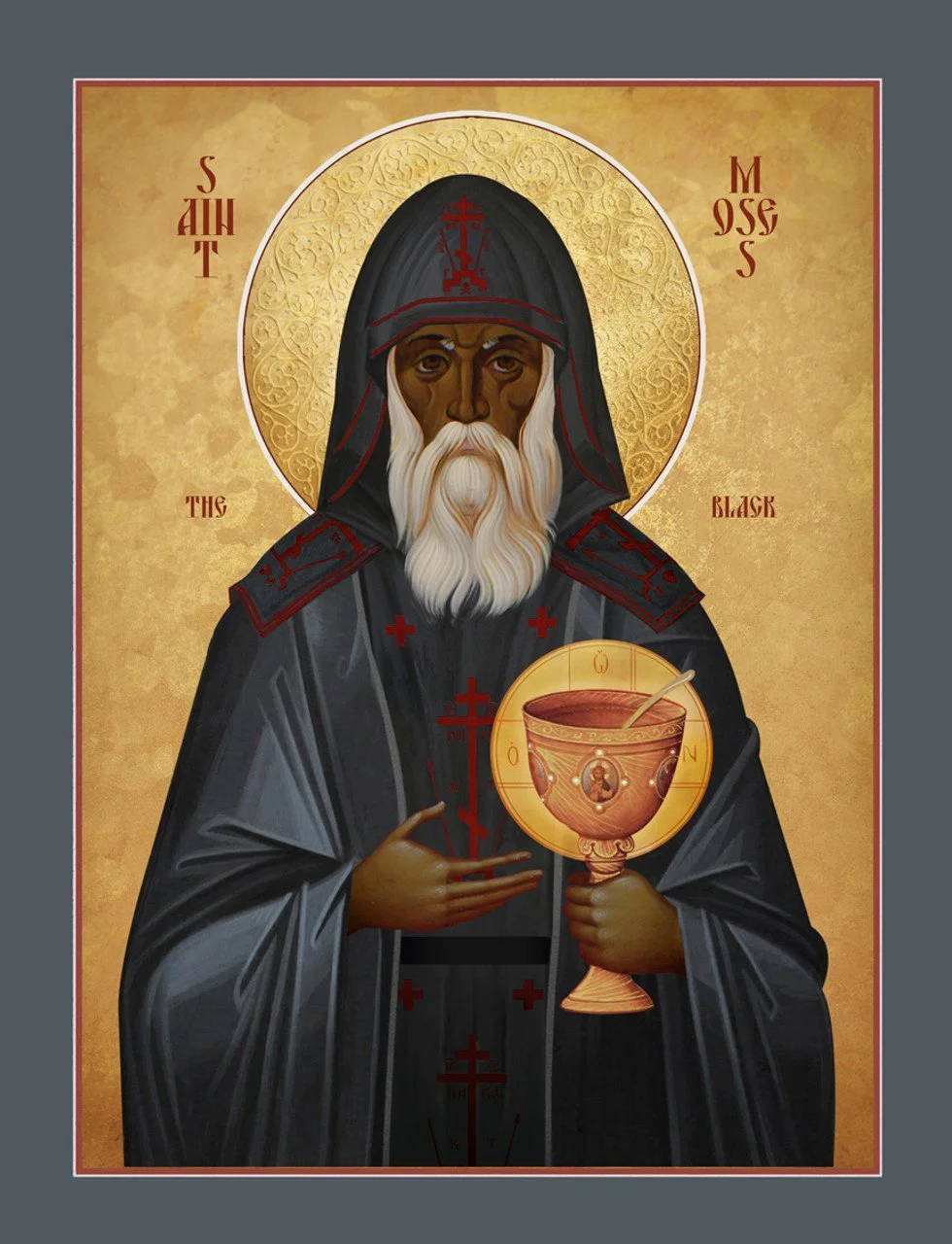 St. Moses the Black was a 4th-century Ethiopian who transformed from a brutal leader of a band of robbers into a revered desert monk and martyr. After fleeing from the law, he sought refuge in a monastery, where he was overwhelmed by the monks' peace and began a new life of repentance. He endured spiritual battles and became a wise and respected elder before his martyrdom at around age 75 when he, along with seven other monks, refused to flee from attacking bandits and was killed.